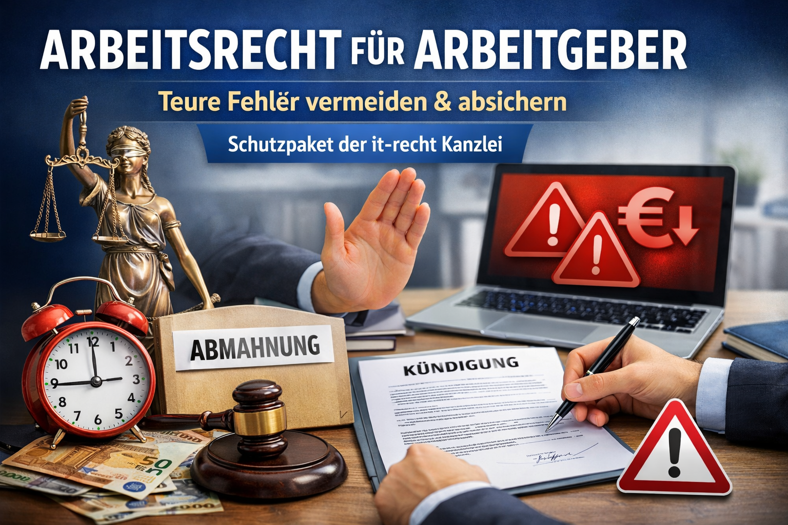 Arbeitsrechtliche Vorgaben sind umfangreich und können bei Versäumnissen schnell teuer werden – sowohl durch Bußgelder als auch durch gerichtliche Auseinandersetzungen. Arbeitgeber sollten ihre Prozesse daher aktiv gestalten und rechtlich absichern. Rechtlich geprüfte Muster, wie sie z. B. im Schutzpaket Arbeitsrecht der IT-Recht-Kanzlei angeboten werden, sind dabei ein praktisches und kosteneffizientes Werkzeug, um Risiken zu reduzieren und arbeitsrechtliche Pflichten sicher zu erfüllen.