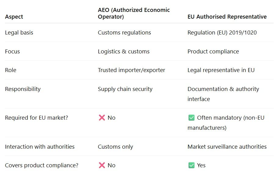 The distinction between AEO and an EU Authorised Representative is often misunderstood. Many companies assume that customs-related certifications automatically cover product compliance. This confusion creates a dangerous blind spot, where responsibilities are unclear and regulatory requirements are only partially fulfilled — until authorities take a closer look.