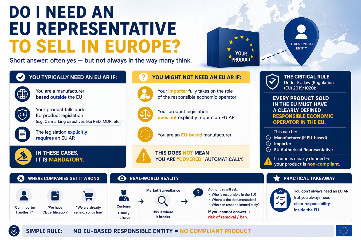The requirement for an EU Authorised Representative depends on your specific setup. It is not universally mandatory — but in many cases, it effectively is. The key factor is not preference, but whether EU law requires a clearly defined responsible entity within the Union.
