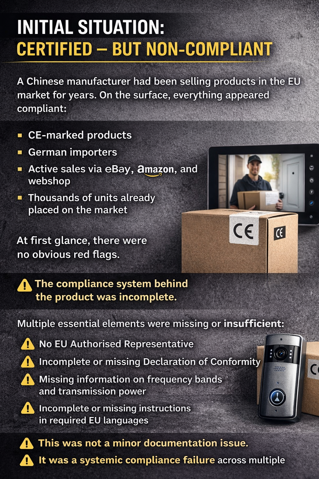 Many manufacturers assume that compliance issues only arise in theory or affect poorly prepared companies. In reality, even established manufacturers with certified products can face serious regulatory consequences when the compliance structure is incomplete. This case study is based on a real-world scenario involving a non-EU manufacturer selling electronic products in the European Union over several years. The products were actively distributed, technically functional, and already placed on the market at scale. However, once authorities became involved, it became clear that the issue was not technical compliance – but a complete failure of the compliance framework behind it.