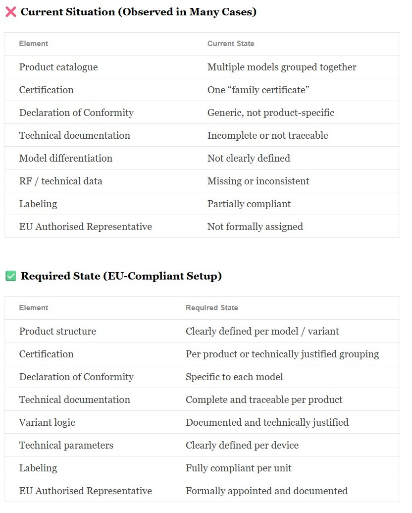 At first glance, grouping products under a single certification appears practical and cost-efficient. However, this approach is only valid under strict technical conditions. Once these conditions are not fully met, the entire certification loses its reliability — turning what seems compliant into a significant regulatory risk.