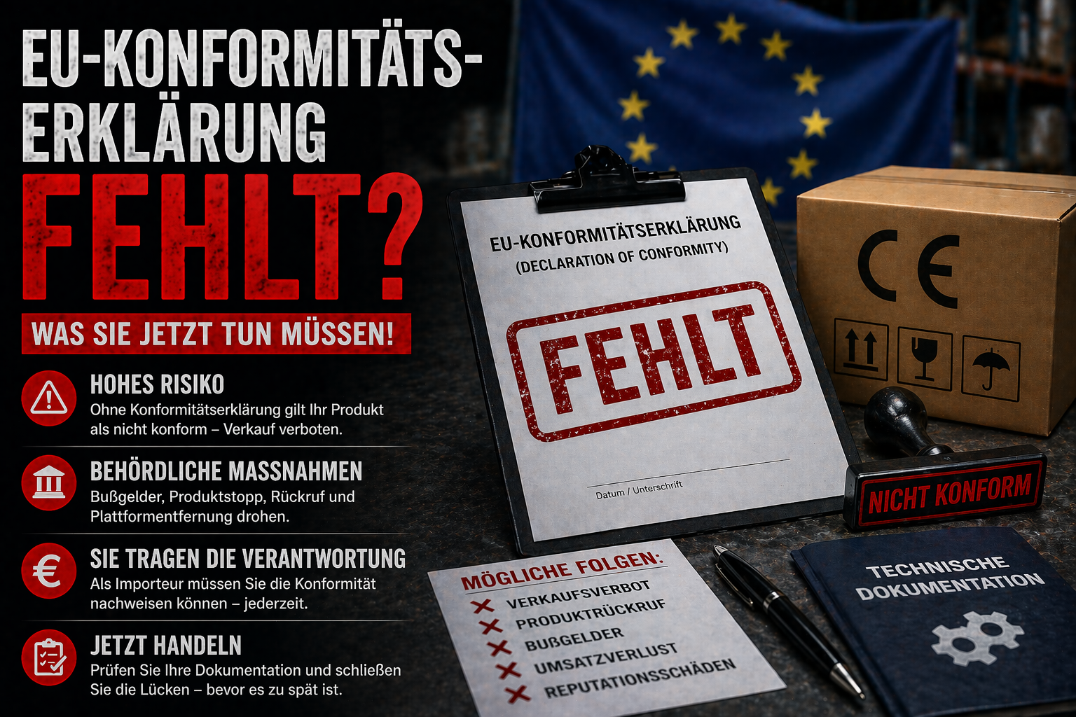 Die EU-Konformitätserklärung ist ein zentrales Dokument für den Marktzugang. Fehlt sie, ist das Produkt rechtlich nicht abgesichert und kann nicht verkauft werden.