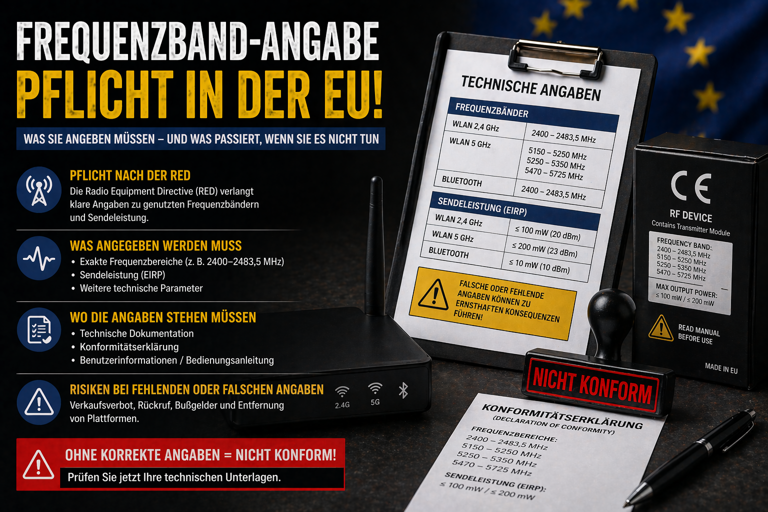 Die Angabe von Frequenzbändern ist kein Detail, sondern ein zentraler Bestandteil der Konformitätsbewertung. Sie entscheidet darüber, ob ein Produkt im EU-Markt zulässig ist.
