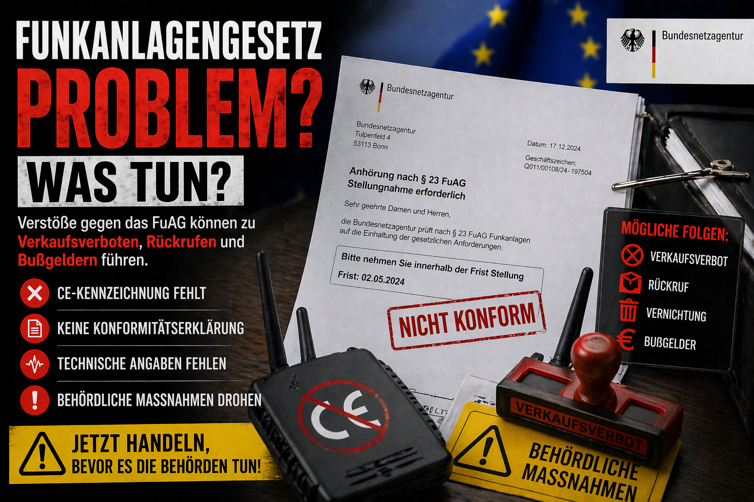 Ein Verstoß gegen das Funkanlagengesetz (FuAG) ist kein formales Detail, sondern ein ernstes Compliance-Problem. Sobald Ihre Produkte betroffen sind, greifen unmittelbare Eingriffsmöglichkeiten der Behörden. Viele Unternehmen erkennen die Tragweite erst, wenn bereits ein Verfahren läuft – und verlieren dadurch wertvolle Zeit.