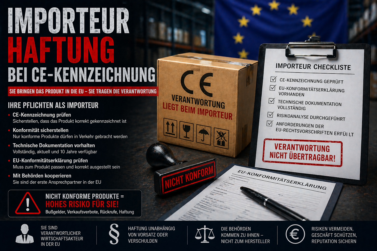 Als Importeur tragen Sie die Verantwortung für die CE-Konformität Ihrer Produkte – unabhängig davon, wo diese hergestellt wurden. Diese Verantwortung lässt sich nicht auf den Hersteller verlagern.