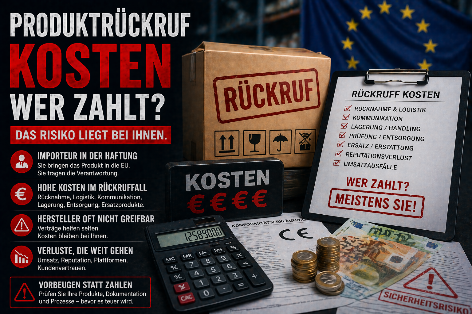 Ein Rückruf ist kein isoliertes Ereignis, sondern das Ergebnis einer nicht funktionierenden Compliance-Struktur. Die Kosten entstehen nicht durch den einzelnen Fehler, sondern durch die fehlende Kontrolle über Produkte und Prozesse.