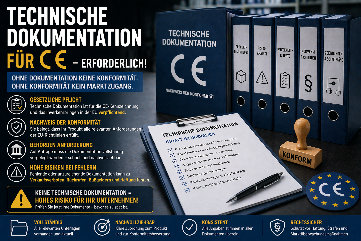 Technische Dokumentation ist nicht nur ein Pflichtbestandteil, sondern die Grundlage für jede Bewertung der Konformität. Ohne sie kann ein Produkt nicht als konform gelten – unabhängig davon, ob es technisch geeignet ist.