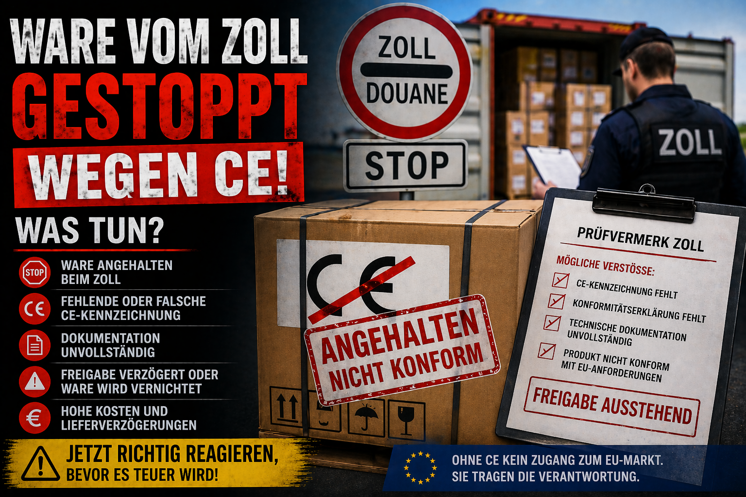 Ein Zollstopp wegen CE ist kein Einzelfall, sondern ein klares Signal. Wer jetzt nicht strukturiert handelt, riskiert Verzögerungen, Verluste und weitere Maßnahmen.
