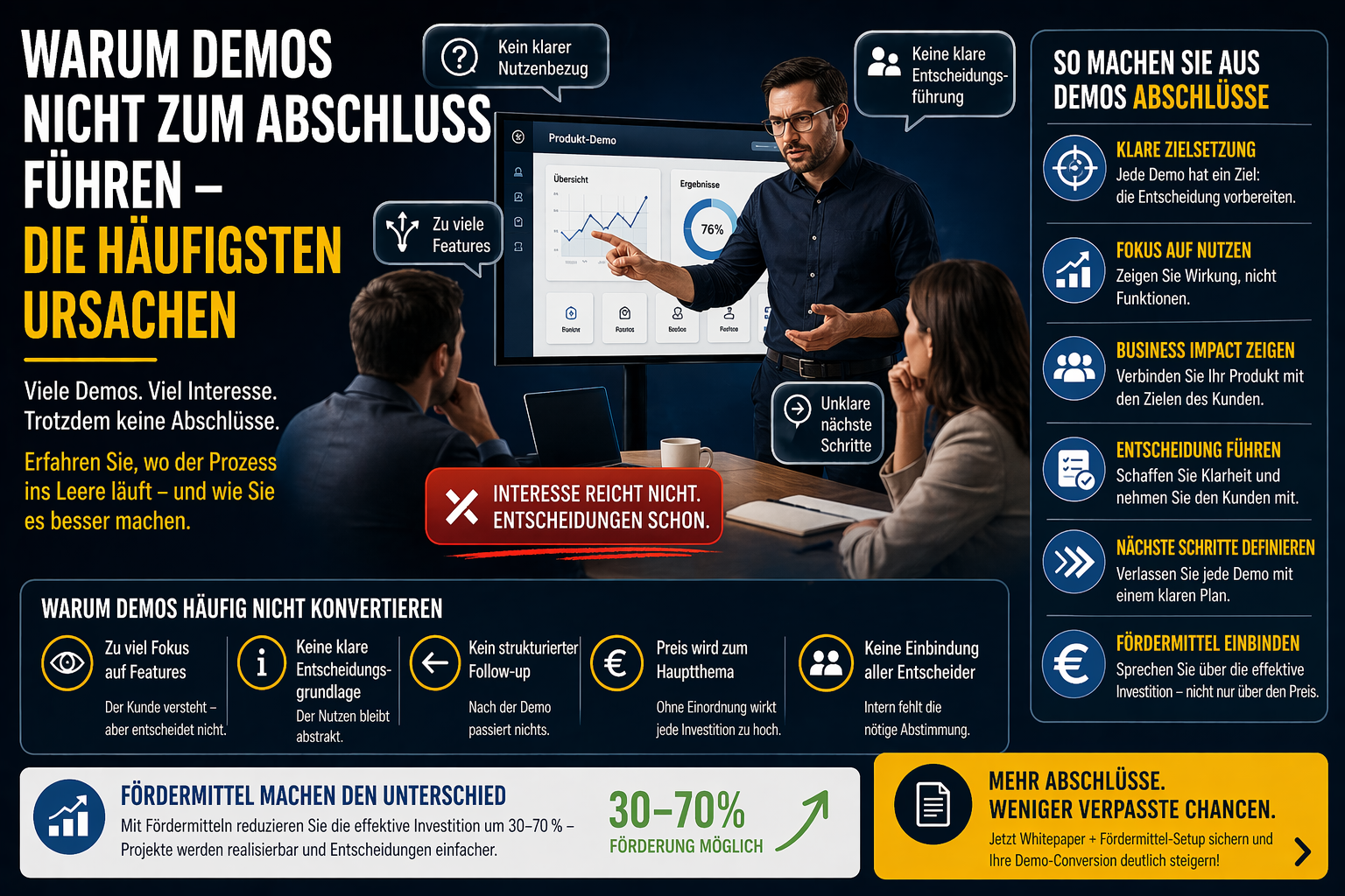Ein entscheidender Faktor fehlt in den meisten Demos komplett: die tatsächliche Investition. Kunden sehen nur den Preis, nicht die Möglichkeiten zur Reduktion. Fördermittel können genau hier den Unterschied machen und die Demo massiv aufwerten.
