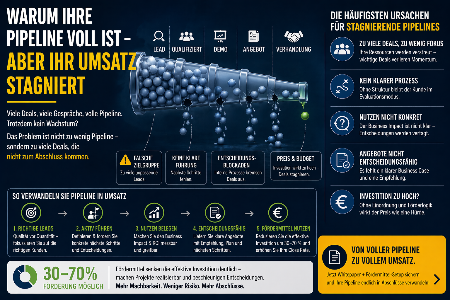 Ein entscheidender Hebel zur Aktivierung der Pipeline wird oft ignoriert: die tatsächliche Investition. Viele Deals stagnieren, weil sie als zu teuer wahrgenommen werden. Fördermittel können genau diese Blockade auflösen.