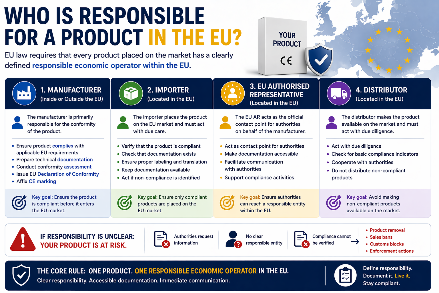 EU product compliance is based on a simple principle: every product must have a responsible economic operator within the EU. This requirement ensures that authorities can access documentation and enforce compliance effectively.